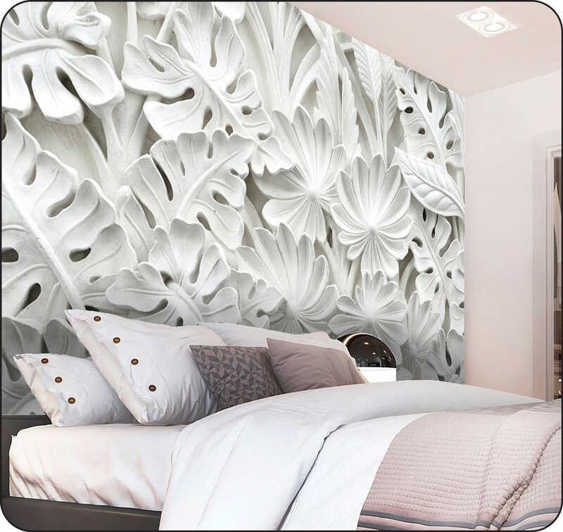 Бумажные фотообои бесшовные VEROL "Белые листья и цветы" 3,1 м2 ширина 200 см высота 155 см, лепнина и резьба на стену для декора, обои бумажные для оформления интерьера дома, отделка стен