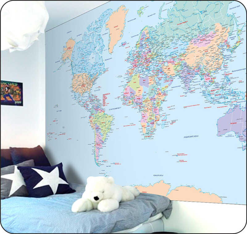 Фотообои бесшовные Verol "Карта мира, взрослая, подробная" 3,76 м2 ширина 243 см высота 155 см обои бумажные для стен в офис, фотообои в детскую комнату, декор для интерьера, отделка стен кабинета