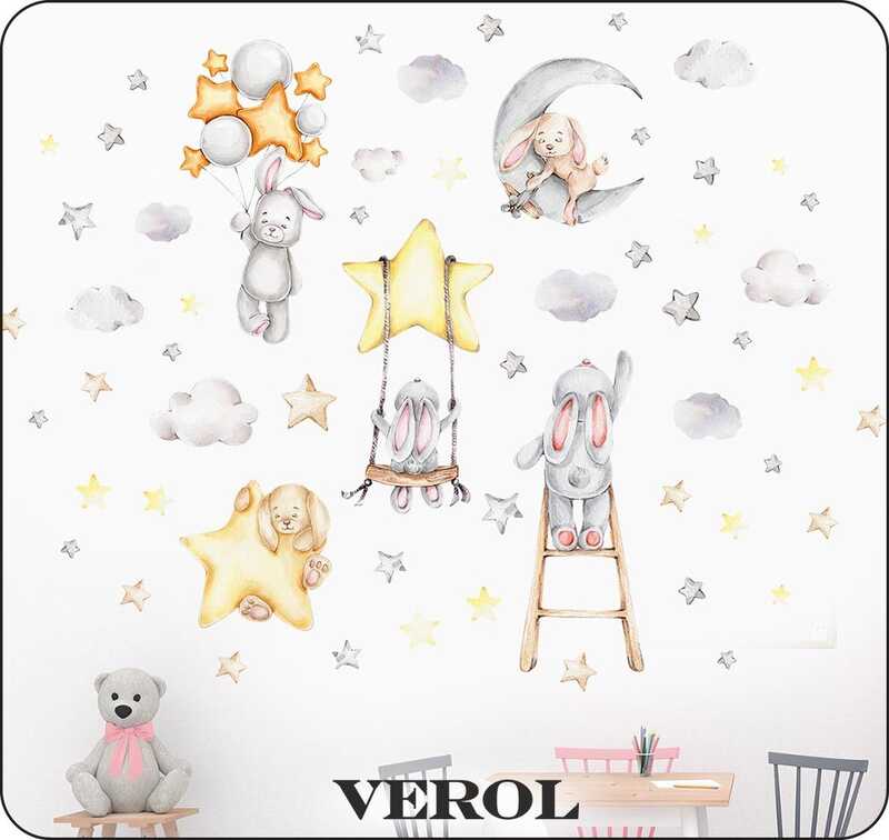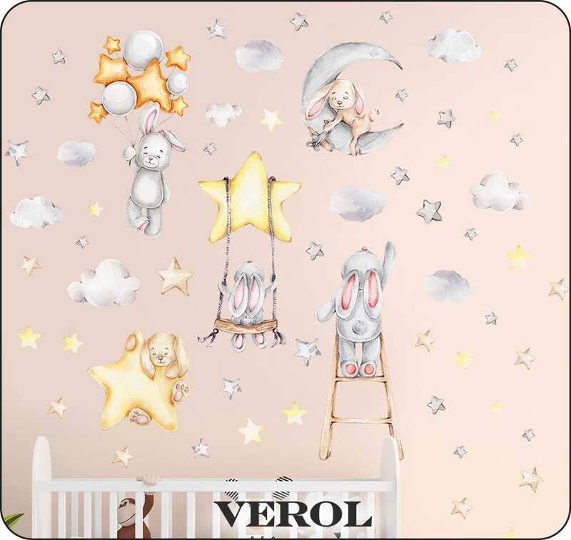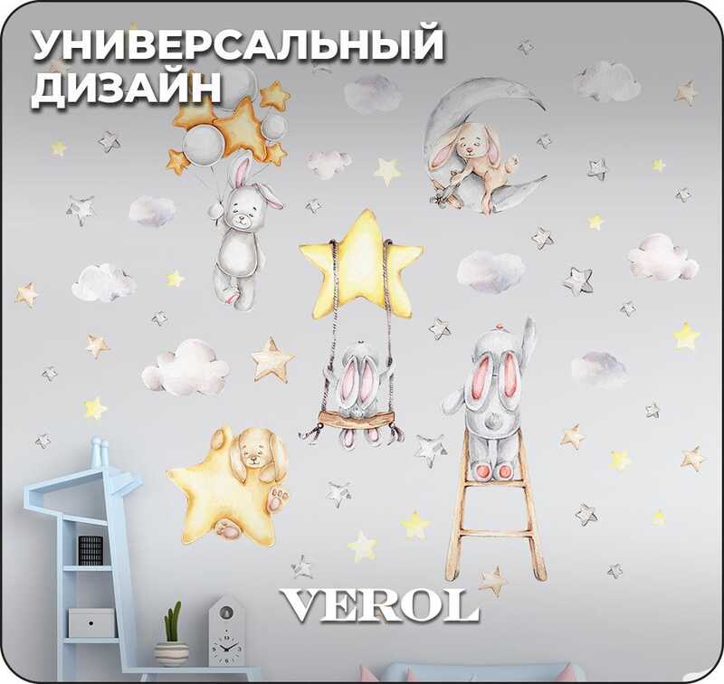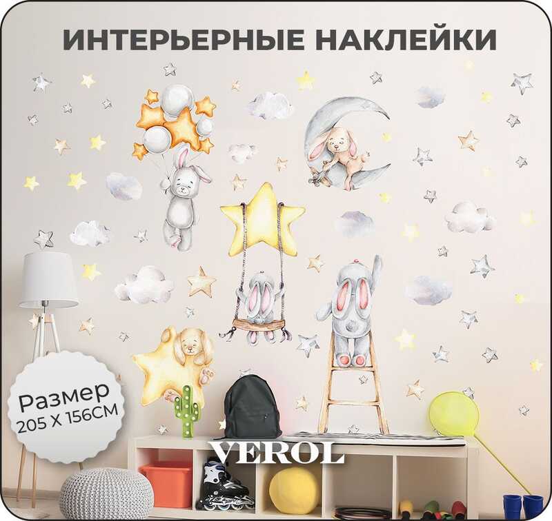 Наклейки для детей интерьерные VEROL "Зайки и звезды" на стену в детскую, самоклеющаяся пленка для мебели, виниловые стикеры набор 92 шт