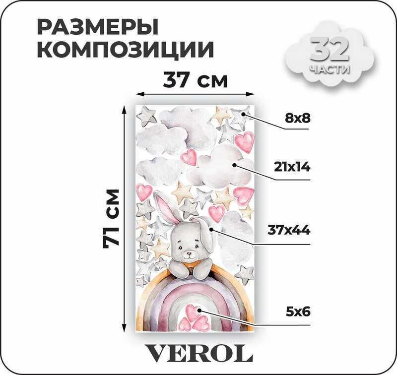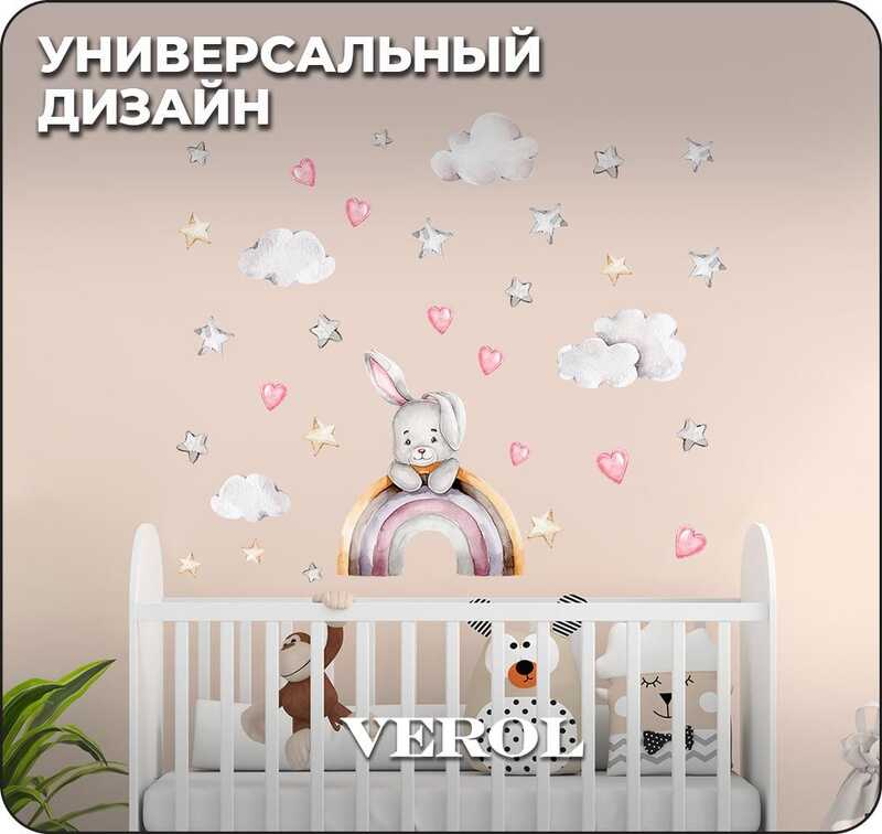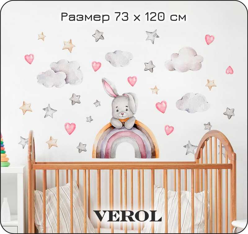 Наклейки для детей интерьерные VEROL "Зайка на радуге" на стену в детскую, самоклеющаяся пленка для мебели