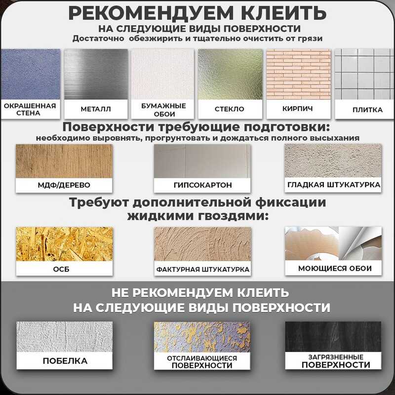 Не рекомендуем закреплять на фактурные обои, а также на декоративную штукатурку и загрязненные поверхности.